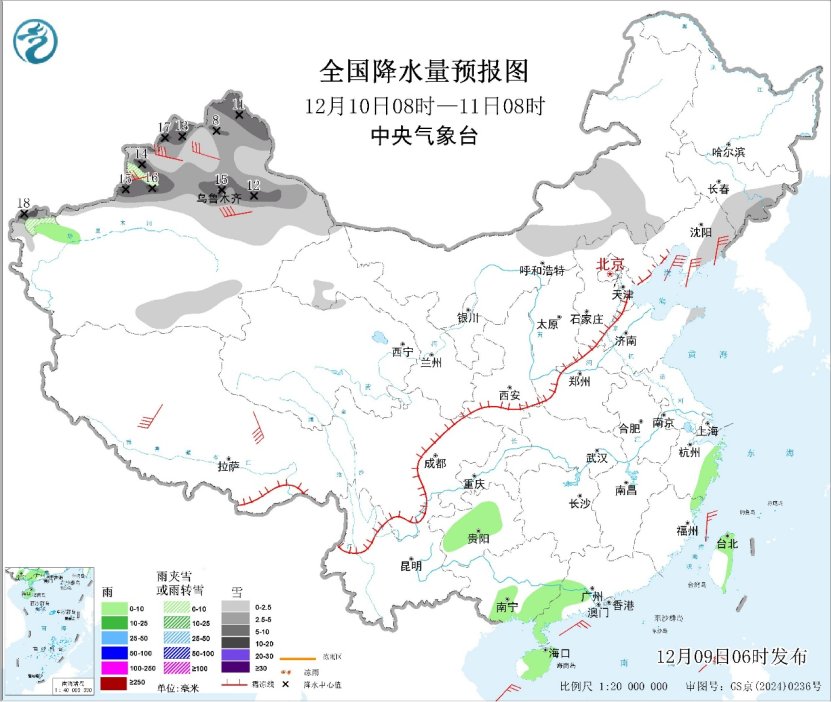 10日,寒潮天气将率先在新疆发力,新疆北疆和南疆西部山区等地部分地区有小到中雪或雨夹雪,其中,新疆阿勒泰地区、塔城、伊犁河谷、沿天山一带以及南疆西部山区等地部分地区有大雪,局地暴雪,新增积雪深度4~8厘米,局地10~18厘米。