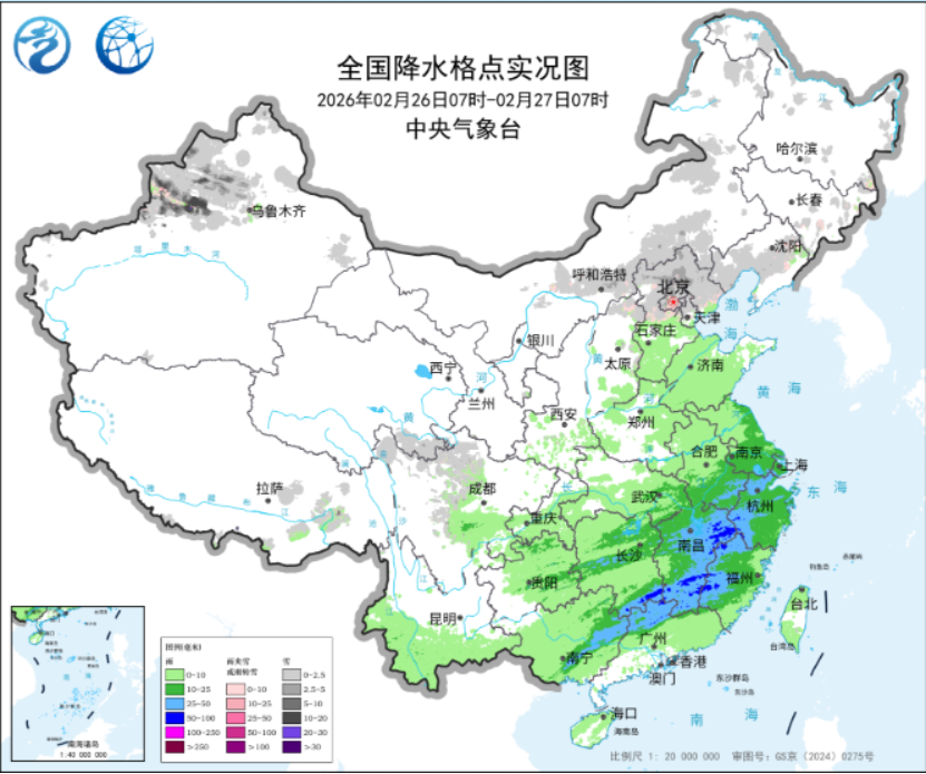 预计今天南方地区大雨或暴雨范围明显收缩,其中湖南西南部、广西中北部、广东、福建等地的部分地区有中到大雨,局地暴雨。另外,2月28日至3月2日,黄淮及以南地区还有新一轮大范围降水天气过程,江南、华南等地部分地区有中到大雨,局地暴雨。